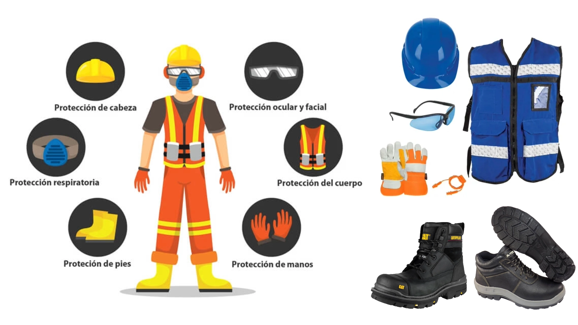 Zapatos de seguridad, casco, chaleco, tapaoidos y lentes.